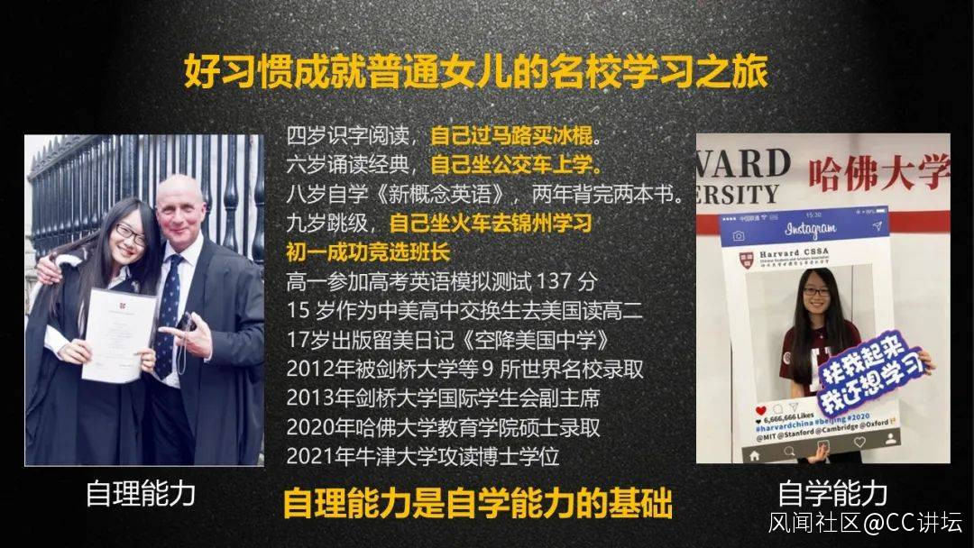 我女兒就是好習慣養成的一個受益者,她四歲識字,六歲讀經典,八歲開始自學英語,九歲跳級。大家一看,這好像一個學霸的人設,但是你知道嗎?她因為小學不參加各種輔導班,小升初的時候,考不上重點初中,中考的時候,考不上重點高中,但是她高考結束的時候,她拿到了世界九所名校的錄取,2012年咱們北京,就有兩個讀劍橋本科的,就有她一個。
