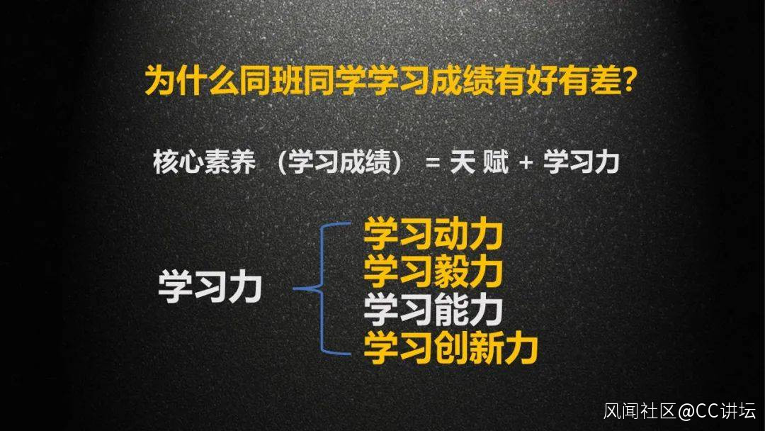 隨着我的讀書和對教育研究的深入,我就發現一個人的核心素養,或者説學習成績,跟兩大因素有關:第一個就是天賦;第二個就是我們的教育的價值,給孩子帶來的學習力。包括這麼四個方面:第一個學習的動力,為什麼而學習,第二個學習的毅力,第三個學習的能力,第四個學習的創新力。