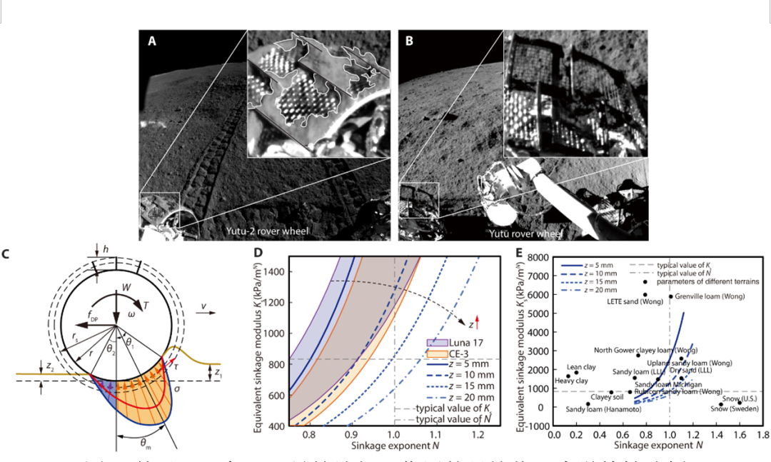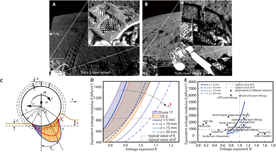 團隊根據月球車車輪與月面作用的信息和地面力學模型估計了月壤的力學特性,結果表明月壤風化層的承壓特性與地球上的幹沙和沙壤土類似,與美國阿波羅計劃中的典型月壤相比具有更強的承壓特性。在多個不同地點的圖像中觀察到“玉兔二號”車輪粘附有大塊團狀土壤,而“玉兔號”的車輪基本不存在粘土現象,表明嫦娥四號着陸區附近月壤內聚力較大,其原因可能是包含較高比例的凝集物,使土壤顆粒經車輪碾壓更易團聚。