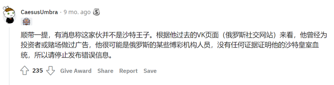 按理來説,互聯網壓根沒法完全統計所有王子,加上4000多位王子的數量,被搞混的可能性也並非沒有。只不過,由紀在互聯網上的舉措實在不太像是一位沙特阿拉伯出身的王子——他特別喜歡閲覽一個以俄羅斯文化圈為主的社交網站“VK”,而根據該應用的相關分析數據顯示,VK中來自沙特阿拉伯的IP佔比低於1%。