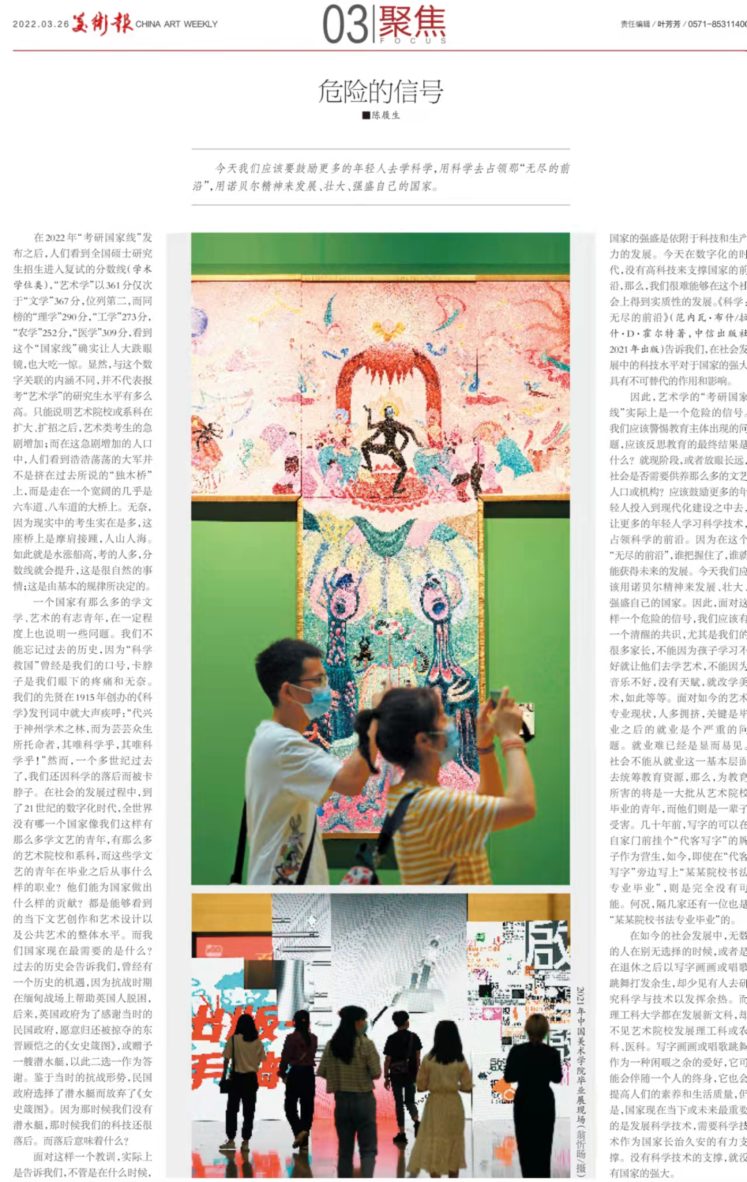 因此,藝術學的“考研國家線”實際上是一個危險的信號。我們應該警惕教育主體出現的問題,應該反思教育的最終結果是什麼?如果我們身邊全是那些寫字畫畫的、唱歌跳舞的,這個國家是如何建設與發展,如何用科技的實力來保護和供養那些寫字畫畫的、唱歌跳舞的。顯然,不是説寫字、畫畫和唱歌、跳舞不重要,那只是少數人、或者是從社會的一個很小的方面。值得思考的是,為什麼全世界只有中國有那麼多的文藝人口?其中相當一般分人或機構是納税人的供養。而就現階段,或者放眼長遠,社會是否需要供養那麼多的文藝人口或機構?如果像今天這樣超越了社會的主體,超越了理工科,超越了科學技術,那一定是個問題。試想今天的疫情已經3年,不是靠寫字畫畫或唱歌跳舞所能解決的;人們的生命和健康依靠的是醫學和科學。應該鼓勵更多的年輕人投入到現代化建設之中去,讓更多的年輕人學習科學技術,佔領科學的前沿。因為在這個“無盡的前沿”,誰把握住了,誰就能獲得未來的發展。而我們不可能永遠去模仿他人;我們需要有自己的獨立創造。我們不能用寫字畫畫和唱歌跳舞來換取糧食,來維繫生命健康;也不能以寫字畫畫和唱歌跳舞當武器。我們曾經有過寫字畫畫和唱歌跳舞當武器的時代,但那個時代已經過去了;而在那個時代中的文藝也只是齒輪和螺絲釘,不是核心的機器。