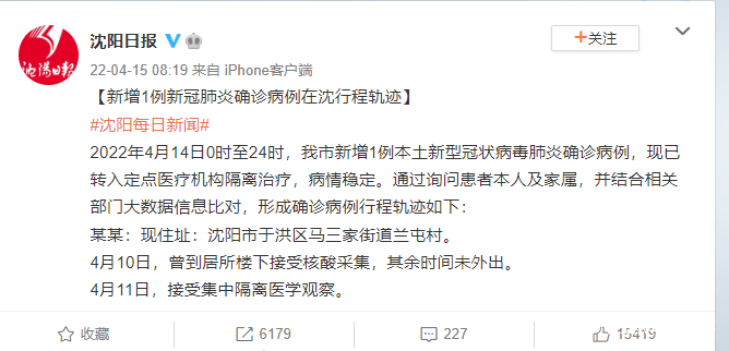 當然這些都是網友自述,有可能是在扯淡,直到今天瀋陽發了一個病例的流調報告,説病人除了4月10日下樓做核酸以外沒去過任何地方。