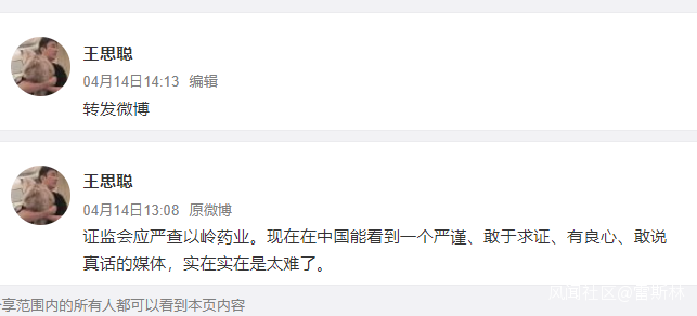 證監會應嚴查以嶺藥業。現在在中國能看到一個嚴謹、敢於求證、有良心、敢説真話的媒體,實在實在是太難了。