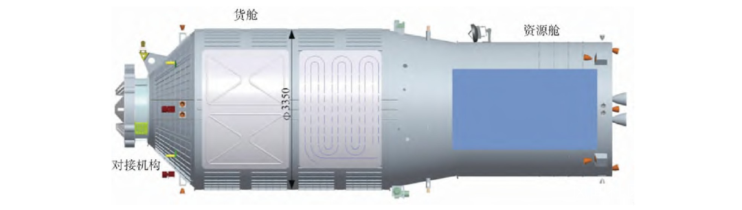 貨運飛船由貨物艙和推進艙兩艙組成。貨物艙用於裝載和存放乘員用品、實驗載荷等。考慮到空間站艙外建造需求,貨運飛船採用模塊化貨艙設計,與推進艙組合,適應補給物資、艙外大型載荷、實驗平台等的運輸需求。貨物艙有全密封、半密封和全開放三種形式。貨運飛船還具有支持科學技術實驗的能力,從而可以利用保障貨物運輸以外的剩餘上行運輸能力完成科學實驗任務,提高飛行試驗效益。貨運飛船構型如圖3。