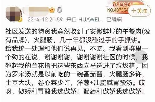 前幾天,她在微博上吐槽,社區發來的物資中的安徽蚌埠午餐肉、火腿腸都沒有品牌,於是傲嬌地把這些食物扔進了垃圾桶。還略帶挑釁地寫道:傲嬌和胃酸我選傲嬌,配藥和傲嬌我選傲嬌。