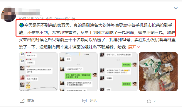 有不少朋友總結自己一天是這樣過的:晚上打開冰箱清點一下剩下的物品,然後半夜在各種搶菜鬧鈴中醒來,白天在各種羣裏找團購買菜的信息,期間則要工作/帶孩子/檢測核酸。