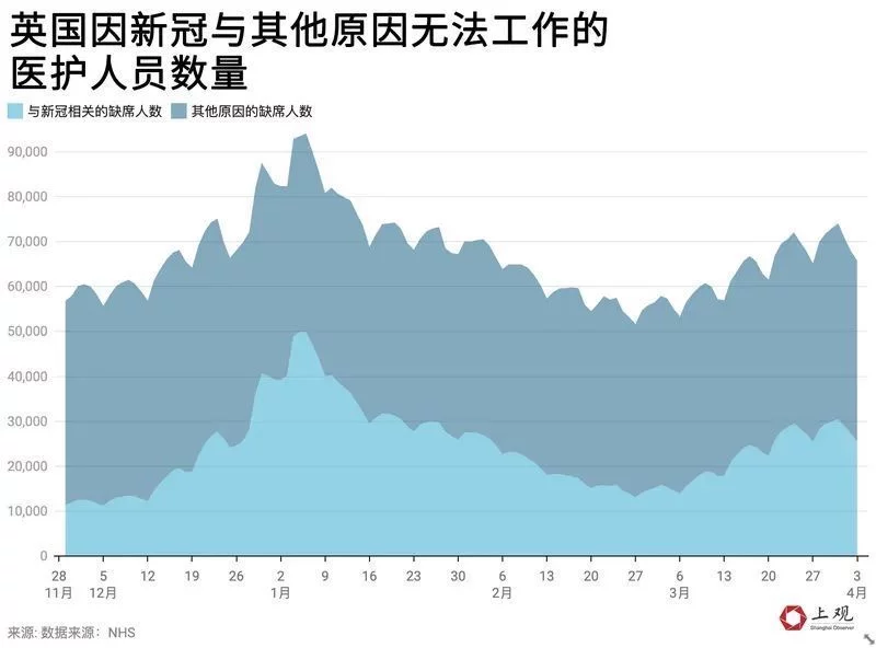 根據英國國家醫療服務體系(NHS)公佈的最新數據顯示,在3月中旬後,英國平均每天有超過2萬名醫護人員因為感染新冠而無法工作。加上其他因素的影響,英國平均每天有約6萬5千名醫護人員無法工作。