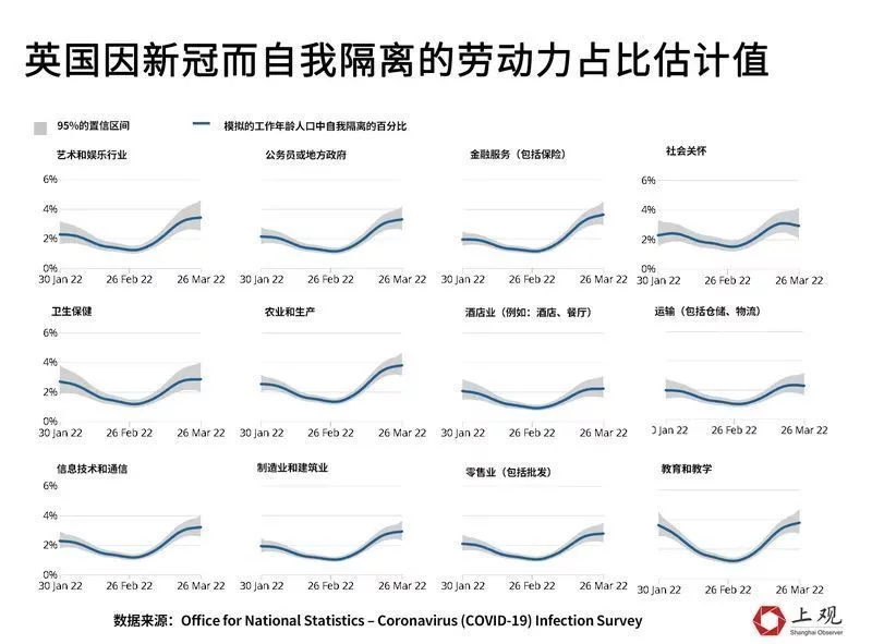 英國國家統計局根據2021年12月5日至2022年1月29日的數據進行預估,發現各行業在3月的缺勤率都將提升。其中“教育教學”領域受到的影響較大,員工自我隔離的比例在3月26日到達3.8%。