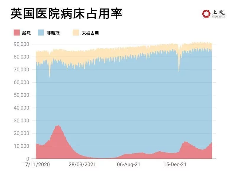3月底,英國病牀空置率僅在5%左右,其中新冠患者的病牀使用率約為14.7%,且還在增加。此前最高值時為2021年1月18日前後,新冠患者的病牀使用率接近31.4%。