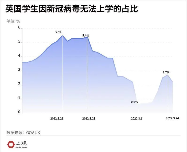 從今年1月份開始英國學校的教師與員工缺勤比率逐漸上升,並在1月28日達到高峯。2月缺勤率有短暫的緩解,但是隨着“與病毒共存”政策的實施,3月份缺勤率再次反彈。