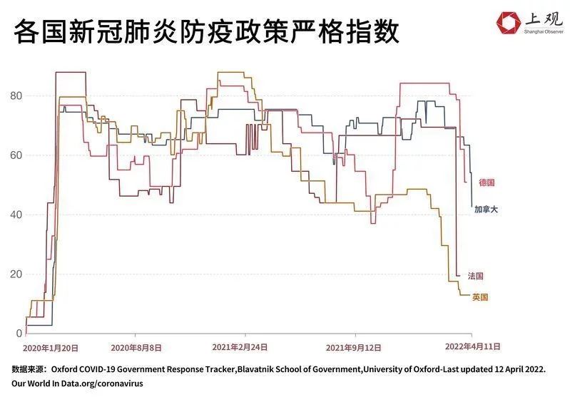 根據其最新數據,英國從今年1月中旬開始解除防疫政策,在1月19日,防疫政策嚴格指數為48.61,而到了4月7日,已降至12.96,是近兩年來的最低值。目前,英國核酸檢測呈陽性者無需依法隔離,政府也不再繼續追蹤密接人羣,也取消了在密閉場所中佩戴口罩的要求。