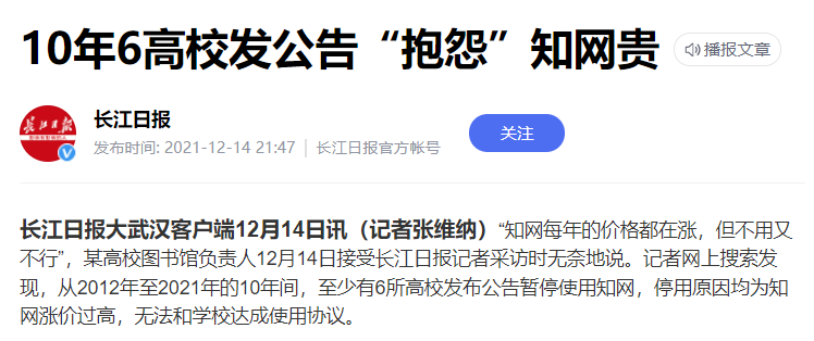 事實上,知網的“貴”已經不是一天半天的事,2021年底,長江日報曾發新聞稱, 10年間已有6所高校“抱怨”知網太貴,包括武漢理工大學、北京大學、太原理工大學、南京師範大學等高校都曾一度停用知網。