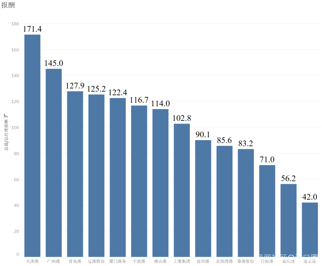 近年來,港口企業實施職業經理人制度,進行薪酬制度改革,將經營業績和高管報酬掛鈎,希望激發傳統港口企業的經營活力。摘取各港口年報中總裁或者總經理的報酬,發現2021年港口企業高管報酬差距明顯,排名靠前的天津港、廣州港幾乎是重慶港、連雲港的3-4倍,經營業績表現亮眼的上港集團、寧波港、唐山港和廈門港務僅在中等水平。