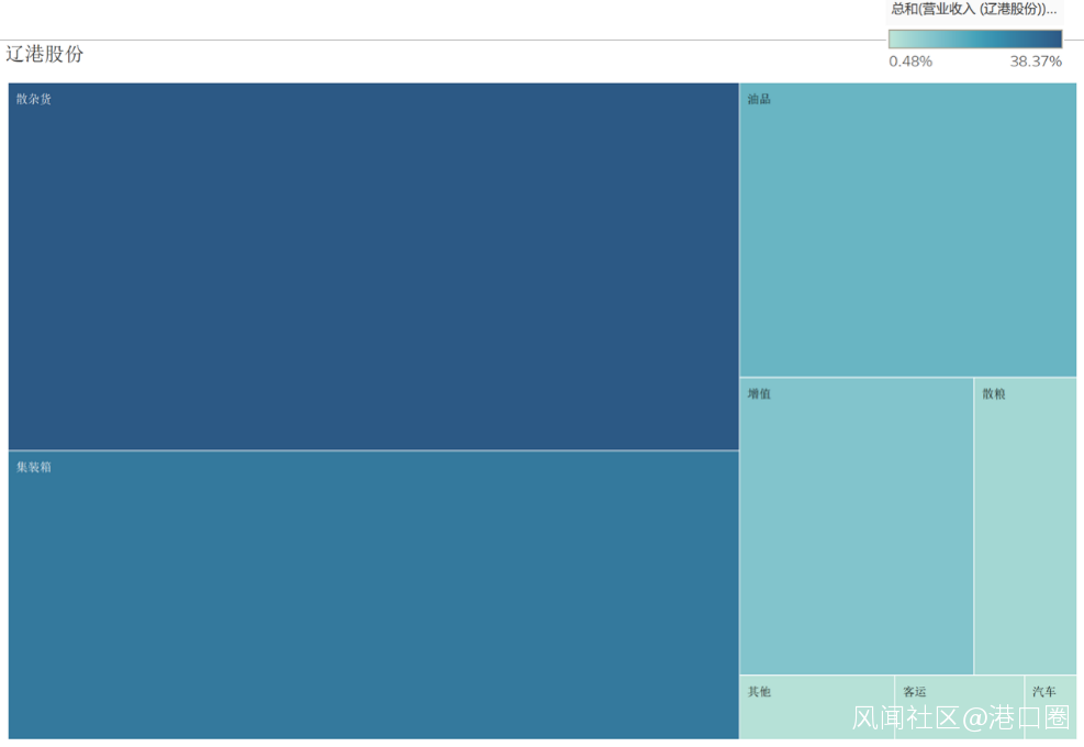 **遼港股份:**散雜貨業務收入佔整體收入的38.37%,其次是集裝箱業務的30.08%,油品佔比14.18%,散糧佔比4.36%。