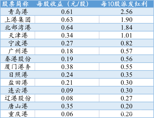 原則上,處於建設成熟期的企業不太會有大額資本開支,現金流遠大於淨利潤,可以高比例分紅。但看每10股派發紅利排名情況,港口企業的分紅率並不高,青島港分紅最高也才每10股派發紅利2.56元,而上港集團和北部灣港分別以1.90元和1.84元緊接其後。