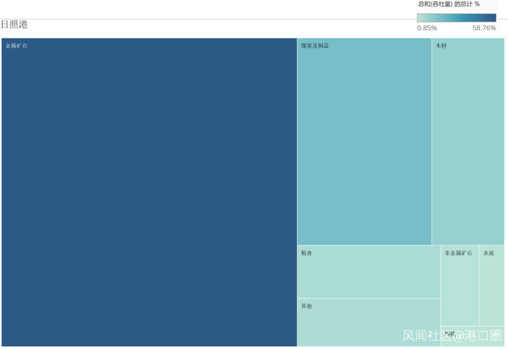 **日照港:**整體收入以港口裝卸為主,按吞吐量來看,金屬礦石佔據第一大貨種,高達58.76%,煤炭及製品和木材分別佔到17.96%和9.70%。