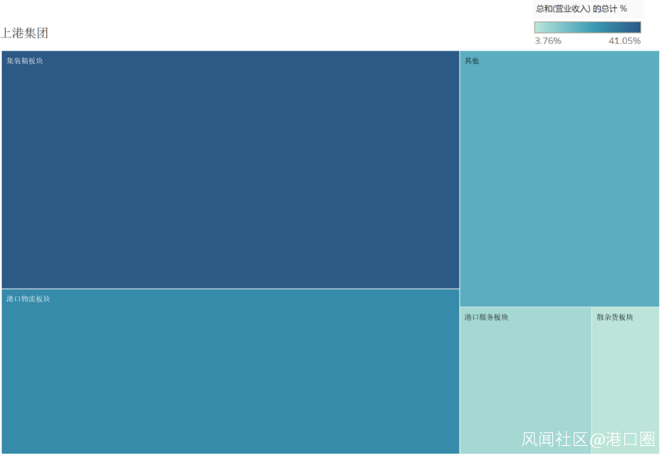**上港集團:**作為連續12年集裝箱吞吐量保持全球第一的上海港港口運營商,集裝箱板塊佔到上港集團整體收入的41.05%,其次是港口物流板塊(即旗下航運公司+物流公司)佔比28.56%,其他部分包括房地產佔比19.31%,而散雜貨業務和港口服務佔比較低。