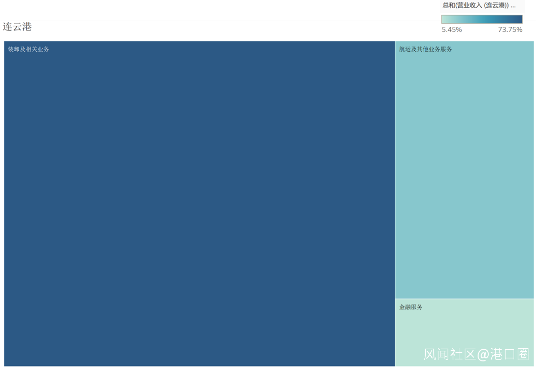 **連雲港:**裝卸及相關業務佔到整體收入的73.75%,航運及其他服務則佔比20.80%,金融服務則佔比5.45%。