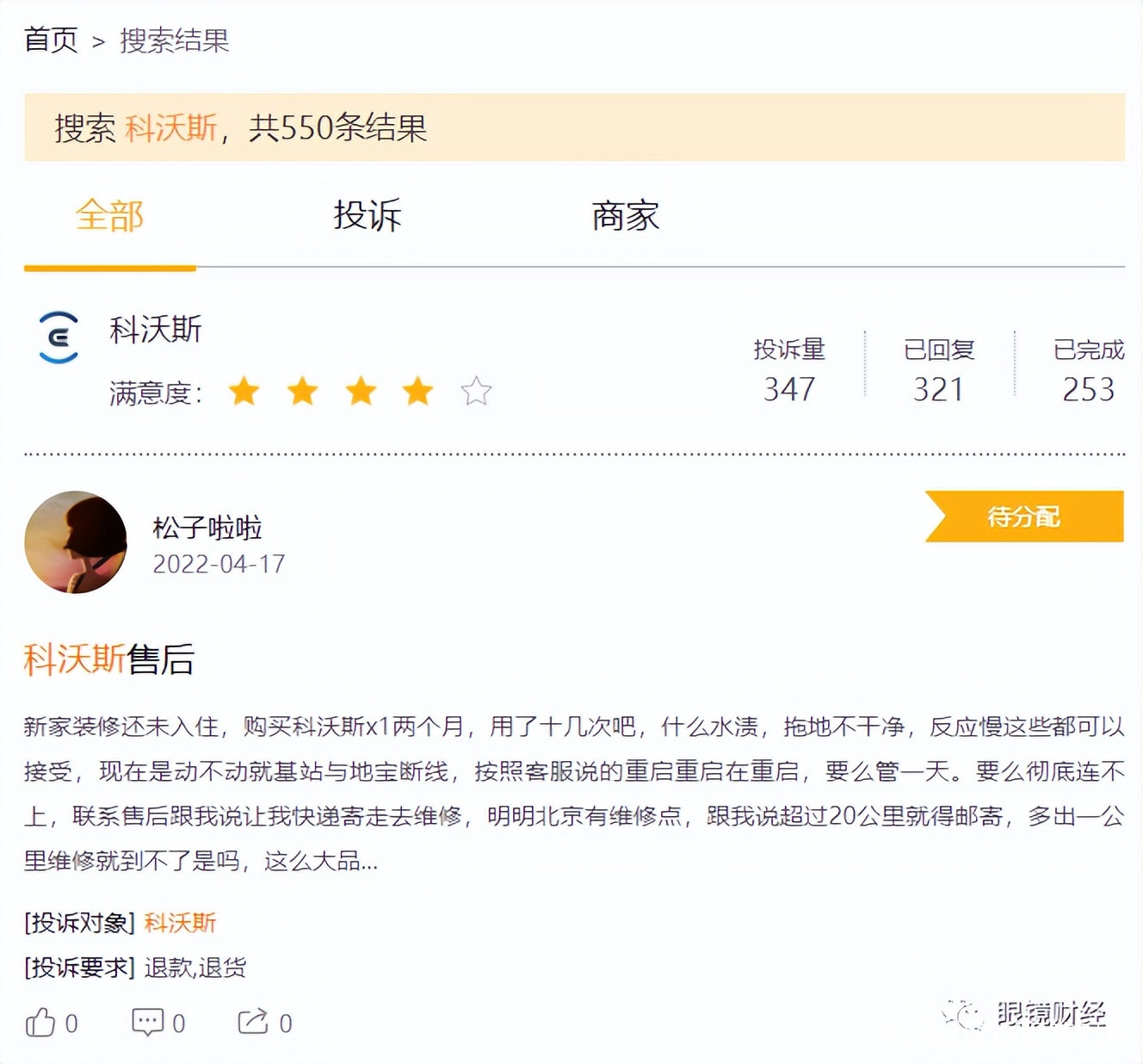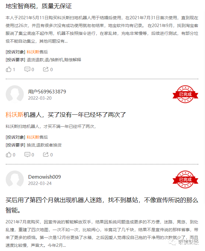 《眼鏡財經》檢索知名投訴平台黑貓投訴發現,截至4月15日,搜索“科沃斯”共有516條結果,投訴344條,已回覆318條,已完成252條,完成率不到一半。“機器人丟失地圖找不到基站”“集塵底座無效”等技術問題引起的售後問題頗為嚴重。