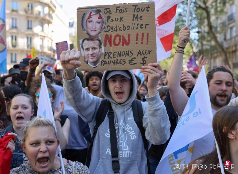 法國多個地區週六出現街頭示威,抗議總統選舉第二輪投票只能從馬克龍和勒龐中二選一。大部分示威者既不支持極右翼的勒龐,也不希望中間派的馬克龍連任,高喊“不要馬克龍也不要勒龐”的口號。在巴黎,不少年輕人走上街頭,高舉寫着“反種族主義和法西斯主義”的標語抗議。