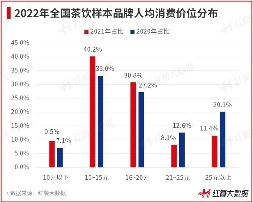 另一個不容忽視的變化是,疫情這兩年消費收縮趨勢明顯,茶飲品牌呈現出人均下滑的跡象。紅餐大數據顯示,2021年茶飲樣本品牌的人均消費價位,20元以下區間的品牌佔到了80.5%,只有11.4%的品牌人均處在25元以上。