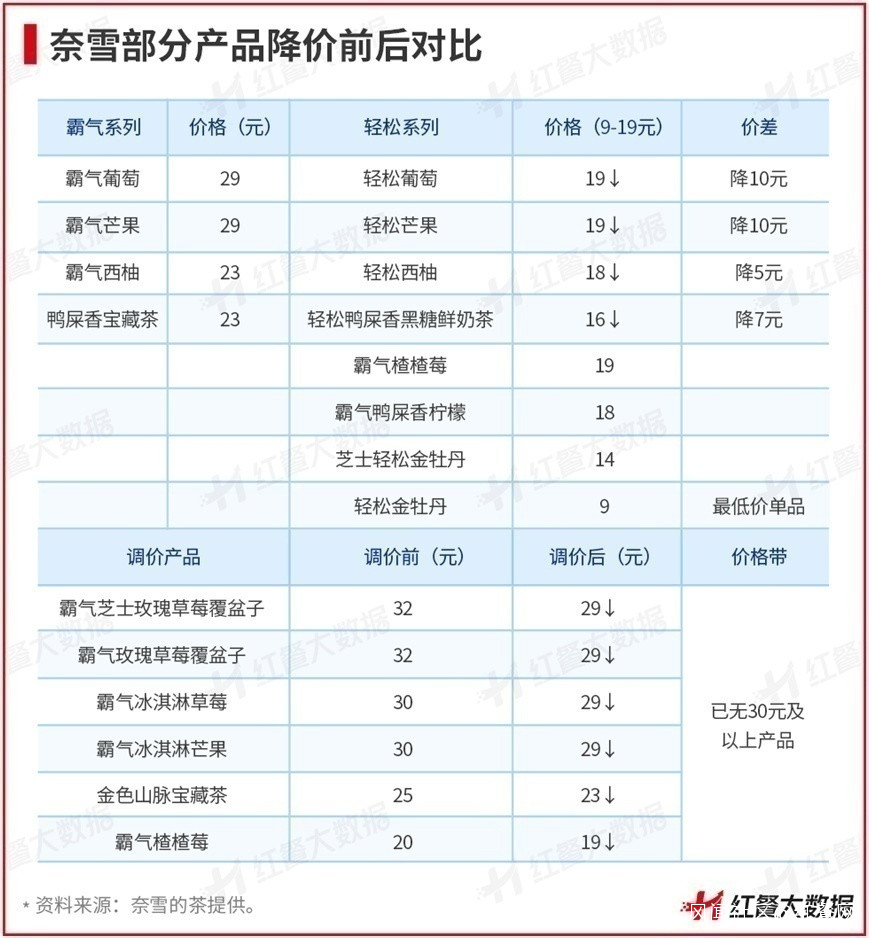 緊接着,3月17日,奈雪的茶也宣佈大幅降價,推出9~19元的“輕鬆系列”,承諾將每月上新至少一款20元以下產品。當前菜單上已經沒有“3字頭”產品,14元~25元成奈雪主力價格區間。從具體調價產品來看,19元的“輕鬆芒果”對比29元的“霸氣芒果”,價差高達10元。而“每月上新至少一款20元以下產品”的承諾,則被視為奈雪長期價格下調的信號。