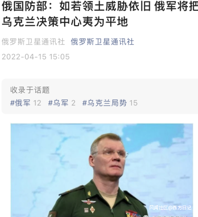 4月13日,俄羅斯國防部發言人科納申科夫講話:俄羅斯將對基輔等地的烏克蘭決策中心發起打擊。