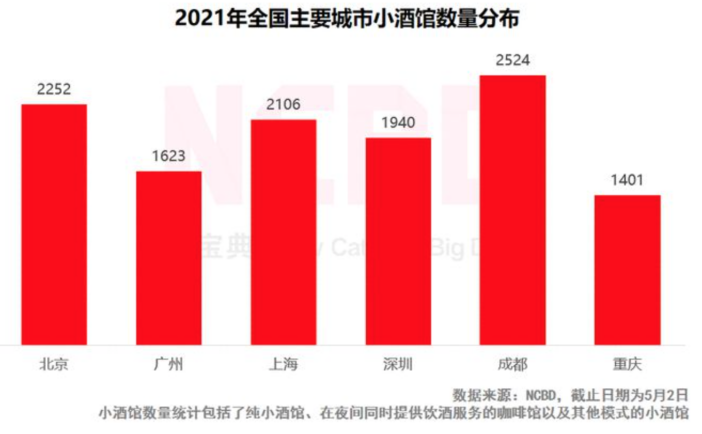 成都可能是中國最能證明“酒吧經濟”價值的城市。根據“NCBD(餐寶典)”發佈的《2021中國小酒館行業發展研究報告》顯示,成都“小酒館”數量全國第一,也是總量唯一超過2500家的城市,比第二名的北京多出了近300家。