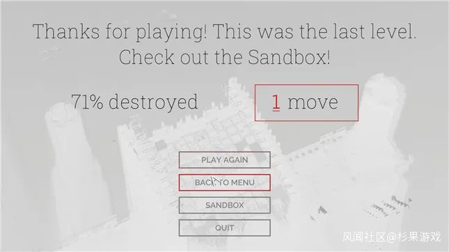 這倒不是因為遊戲本身有多難。如果你單純只想過關,那麼只要領悟設計師的意圖,合理利用機關和手頭資源,就能輕鬆摧毀所有能量核心達成過關條件,不會卡很久。然而在每個關卡的結尾,系統都會計算你摧毀部分佔整個建築物的百分比,鼓勵你儘可能地把樓給拆乾淨。很多時候我卡關就是因為摧毀百分比太低,過關了也覺得不完美,總想試試能不能像保齡球全中一樣一次性摧毀 99% 的建築。