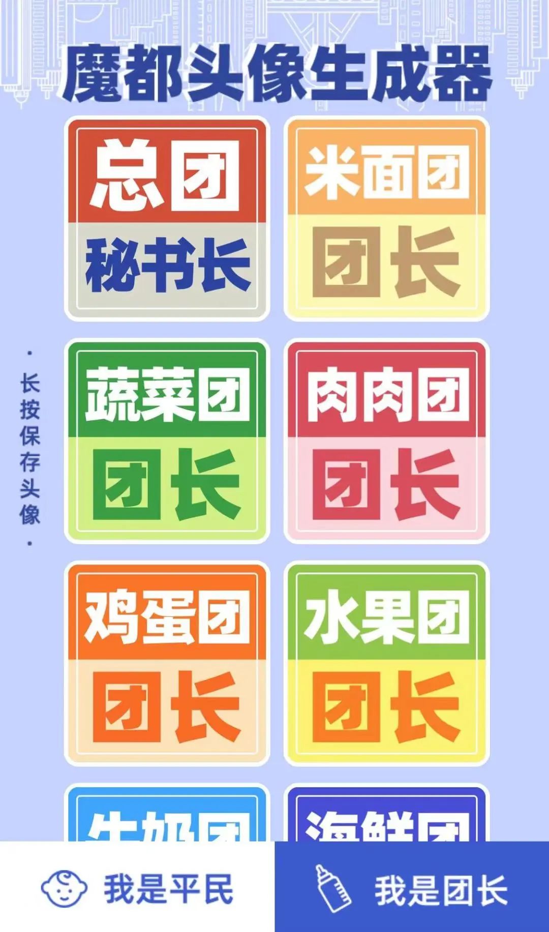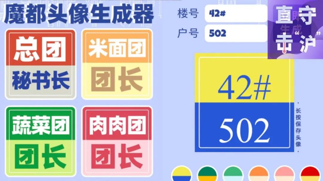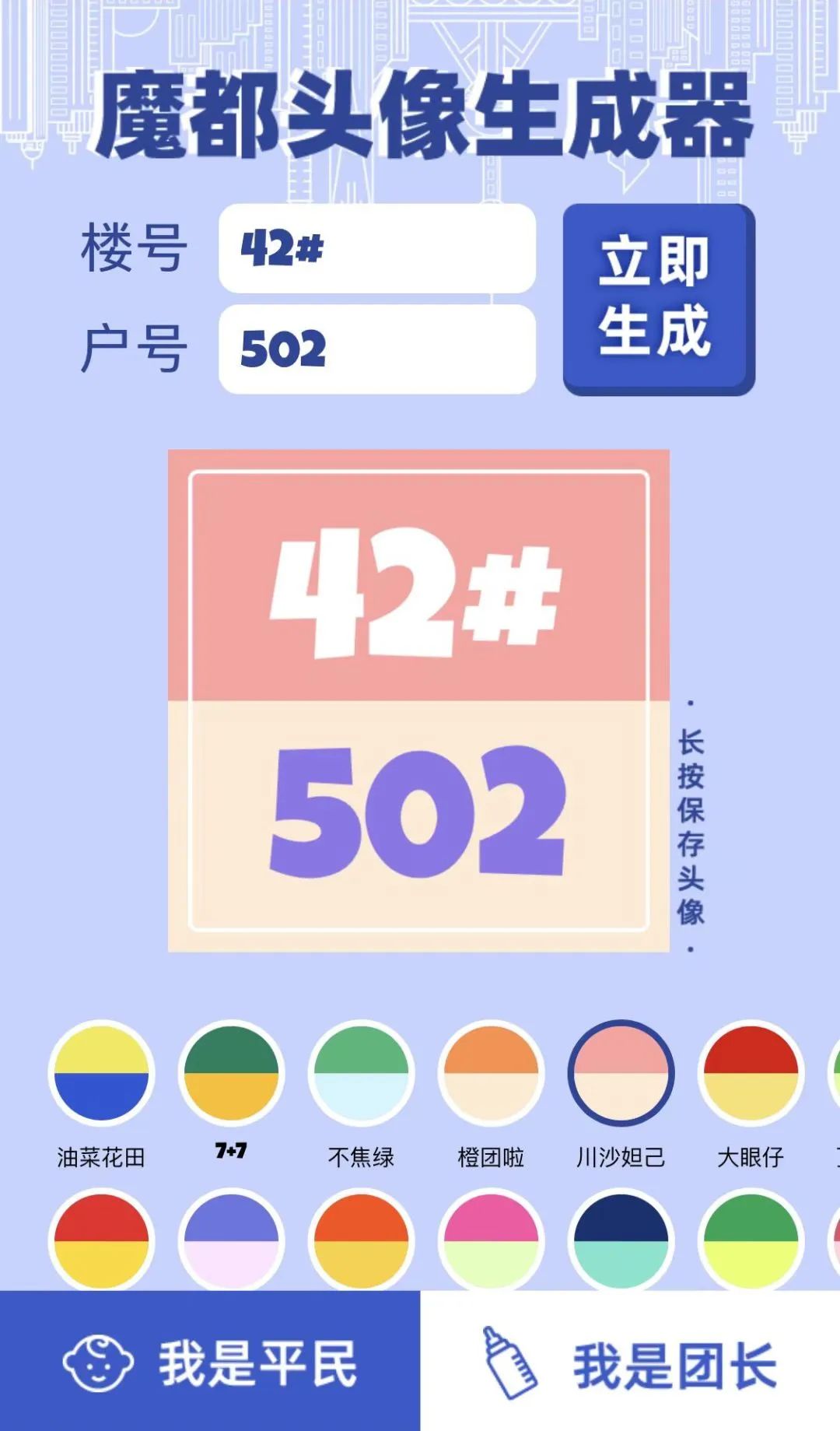 在“魔都頭像生成器”小程序,****普通居民可以選擇“我是平民”,再輸入相應的樓號、户號,就可以生成屬於自己門牌身份的頭像,而且還能選擇不同的顏色。每一種顏色的取名也通過了精心的設計,像不焦綠、橙團啦、我想吃菜、可樂自由……都和這次疫情中發生的事或者大家的心聲有着一定關聯。