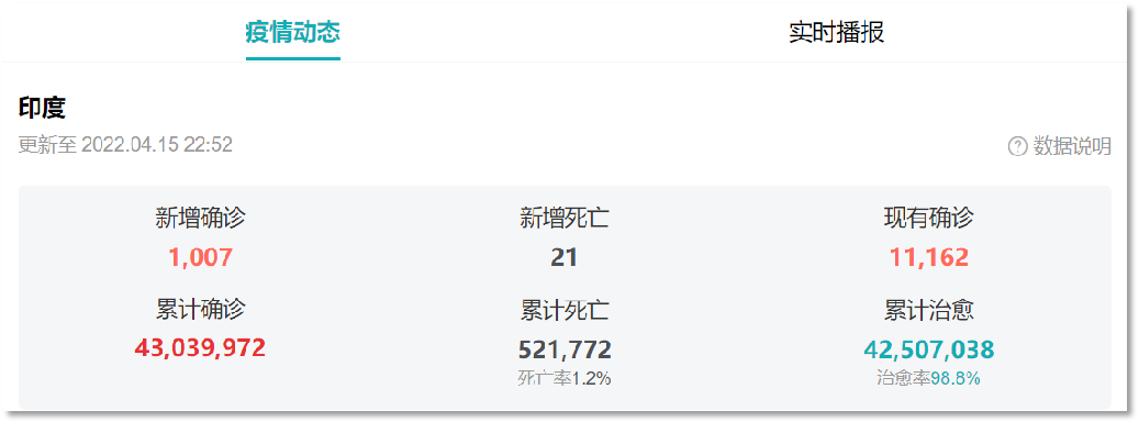 是不是感覺很久沒有聽到這個世界第二的消息了?沒聽到就對了,4月15日公佈的數據,印度14億人,日增才1007例。