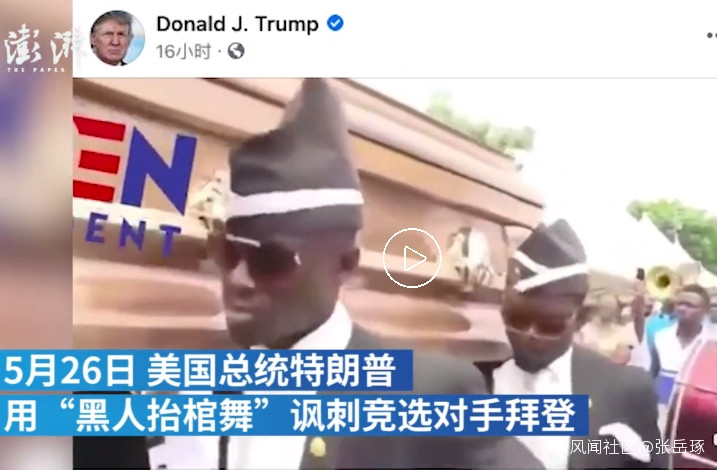 但是“抬棺舞”在世界上名聲大振,主要還得益於美國前總統特朗普的推廣作用。2020年5月26日,美國總統特朗普發佈了一段修改過的“抬棺舞”視頻,他把競選對手拜登的名字印在了棺材上,諷刺拜登有關黑人的政見言論不適當。在特朗普“宣傳”下,“抬棺舞”立即風靡整個世界,各種表情包也紛紛出爐,成為了“新冠”疫情之下,西方社會難得的快樂基因。