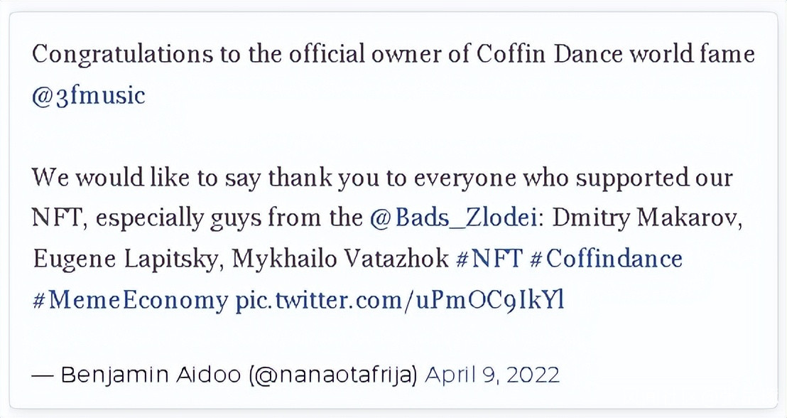 今年4月,抬棺人本傑明·艾杜、馬修和奧爾德里克把“抬棺舞”表情包視頻上傳到YouTube上,決定將其進行拍賣。表情包拍賣成功後,本傑明·艾杜在推特上向“棺材舞”官方所有人“世界知名”的@3fmusic表示了祝賀。