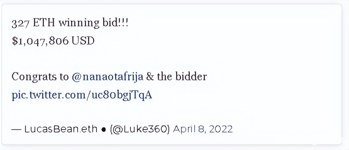 2022年4月7日,加納“抬棺舞”表情包被拍賣。一位名叫Luke360的網友,在推特上興奮地宣佈了中標消息,中標價為1047806美元。
