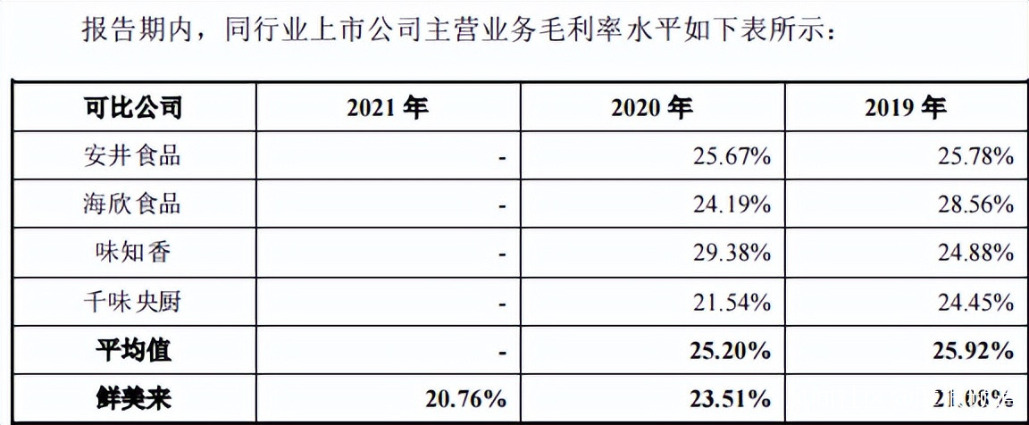 但是,對比同行業來説,味知香與安井食品2020年毛利率分別為29.38%與25.67%;並且,行業平均值為25.20%。可見,鮮美來的毛利率是整體低於同行業可比公司的平均值的。