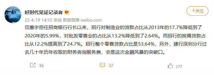 田惠宇擔任招商銀行行長以來,招行對製造業的貸款佔比從2013年的17.7%降低到了2020年的5.99%,對批發零售業的佔比從13.2%降低到了2.64%。而招行的按揭貸款佔比從12.2%提高到了24.7%。招行整個零售貸款佔比是53.64%,另外,建行深圳分行過去幾十年歷年收取的財務諮詢服務費,會是這次金融風暴的突破口。