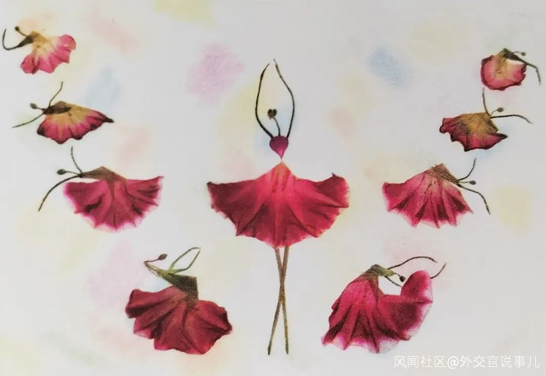 我們家藏有一幅天鵝舞的照片,演員姿態優美動人。李路受到啓發,用牽牛花做了一幅天鵝舞的造型。這是一隻雙臂向後、立腳尖、抬後腿、展翅欲飛的“天鵝”。牽牛花不僅顏色鮮豔,而且還能長時間保持原色,用來做裙很適宜。頭是用半朵海棠花做成,一根花蕊做眼睫毛。頭向上揚,生動可愛。腿是用水仙花的葉片做成,略加修剪。壓幹後的水仙花葉變成了深褐色,很像演員穿的深色舞襪。手臂則用紫菜薹的軟莖做成。
