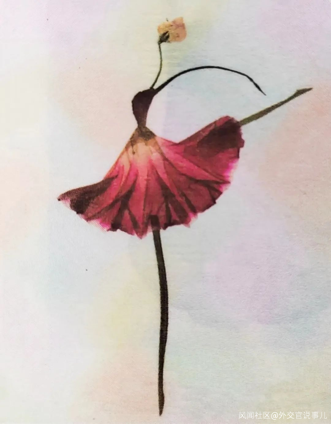 於是,她用銀杏葉做裙子,用在菜市買的紫菜薹花蕾做頭,並做手臂和腿,一個芭蕾舞演員做“大跳”時的動作出現了,那高高昂起的頭,兩條上揚的手臂,雙腿在空中大跳時形成的“一”字形狀,甚至在騰空時空中的一剎那停頓,還有那芭蕾舞演員特有的緊繃的腳背都巧妙地得到了體現。