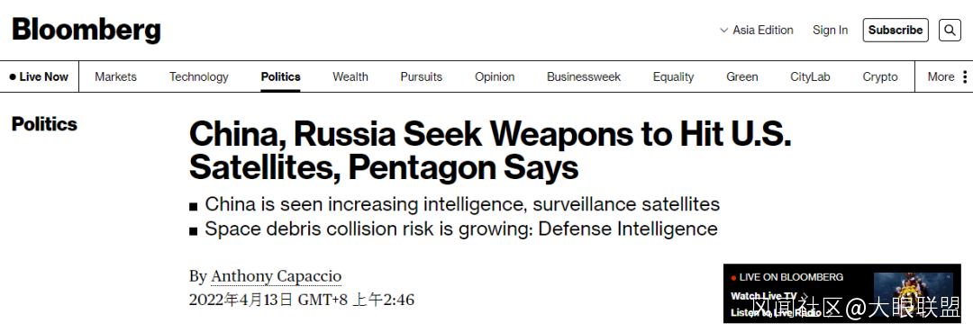 多次在涉華問題上公然撒謊的美國彭博社近日又挖出來一條“大新聞”——五角大 樓情報機構宣稱,“中國和俄羅斯正在持續部署開發能攻擊美國衞星的武器”。