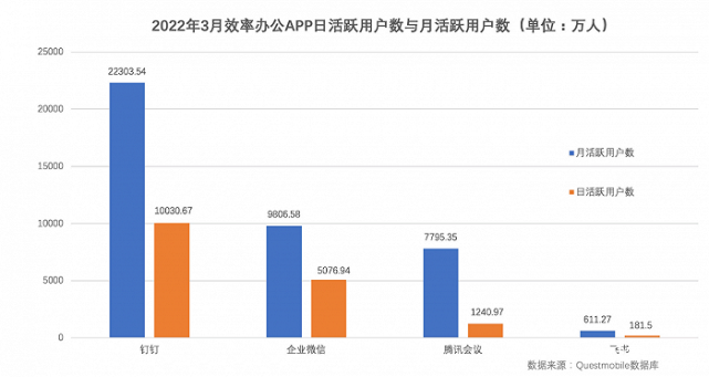 4月15日,第三方機構Quest Mobile公佈了一組數據:釘釘2022年3月MAU2.2億,DAU超過1億,位列效率辦公賽道第一,超過2021年峯值。