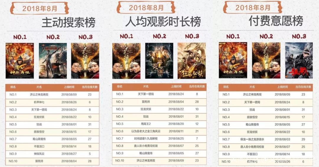 愛奇藝則在2018年8月增加了“有效觀影人次數據”指標,還公佈了主動搜索榜、人均觀影時長榜和付費意願榜三個榜單。這些改變一方面給了更多的參考指標,輔助合作者進行內容運作,另一方面則對流量、票房造假鑽空子的行為進行了精準打擊。