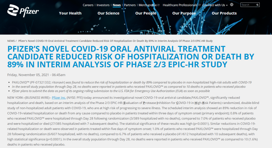 感染三天內服用藥物的感染者,對於輕中症高風險人羣,該藥降低89%住院和死亡風險,28天時,用藥組住院率0.8%(3/389),無死亡,而對照組住院和死亡率7%(27/385),死亡7人。