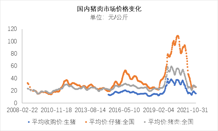 2020年9月左右,豬肉市場仔豬價格開始下降,雖然2021年初有所回升,但從2021年3月左右開始,仔豬平均價開始大幅度下跌。同樣的還有生豬的收購價及全國豬肉價格也出現了大幅下滑。