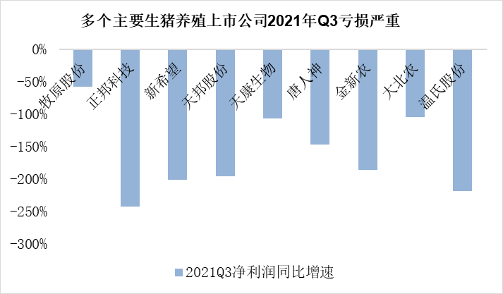 從目前公佈的數據來看,2021年第三季度,多個主要的生豬養殖上市公司當季度淨利潤同比降低幅度均值超過150%。