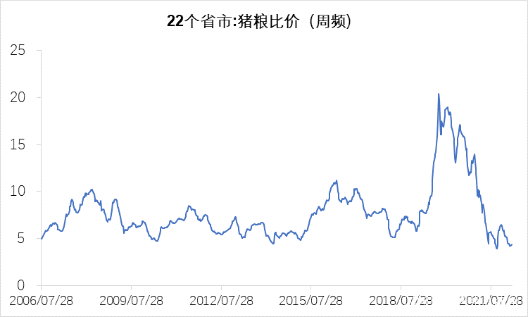 從22個省市的豬糧比價來看,從2019年開始,我國的豬糧比價就一直波動地往下跌。