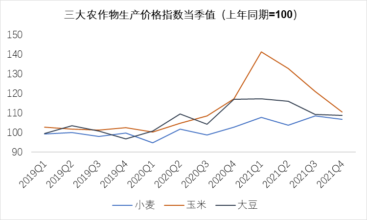 除銷售端價格下降外,養豬的飼養成本上升也給養豬商家帶來不小的壓力。從小麥、玉米、大豆的生產價格指數當季值來看,其數值呈現上升的趨勢。作為豬飼料的重要來源,其價格的上升也帶動了豬飼料價格上漲。