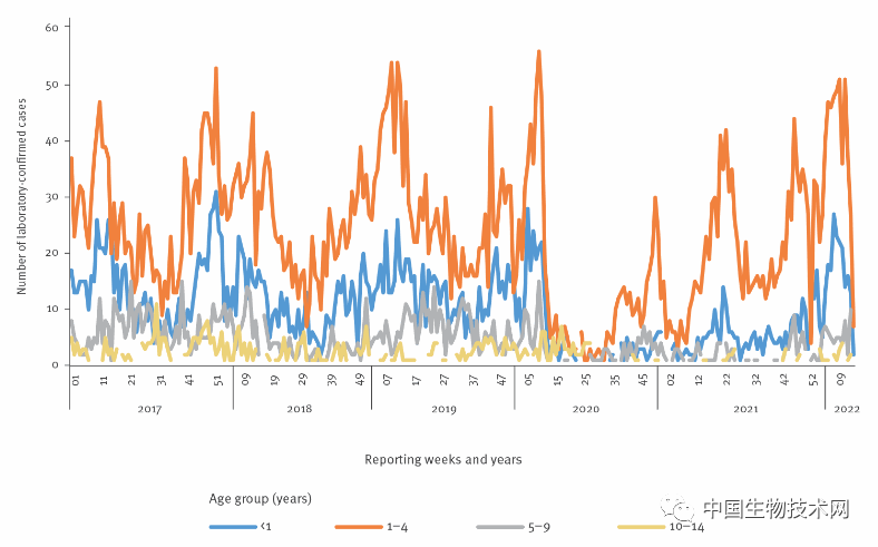 英國自2017年以來實驗室檢測到的腺病毒陽性病例的年齡分佈情況