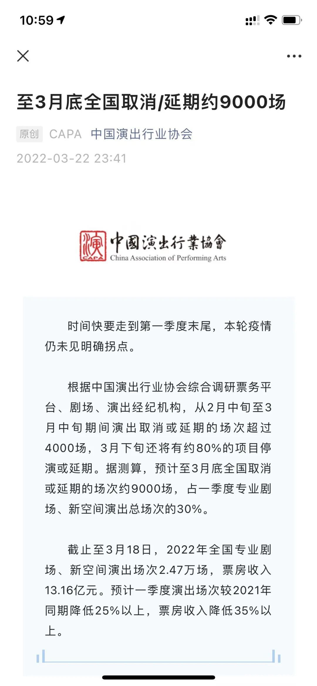 就在上個月,中國演出行業協會發布文章《至3月底全國取消/延期約9000場》,歷數疫情以來演出市場之傷,引起業內極大共鳴。