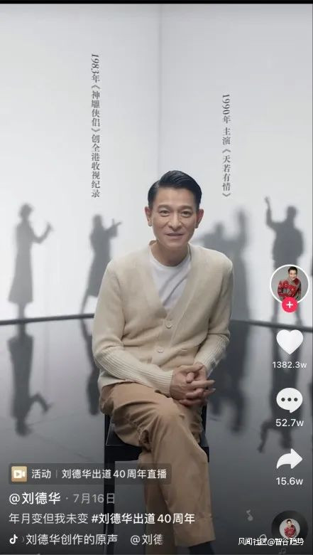 2021年7月29日,老牌天王劉德華選擇在抖音開直播慶祝自己出道40週年。他"不是慶祝一個人紅了四十年,而是慶祝一個人認認真真地工作了四十年。"