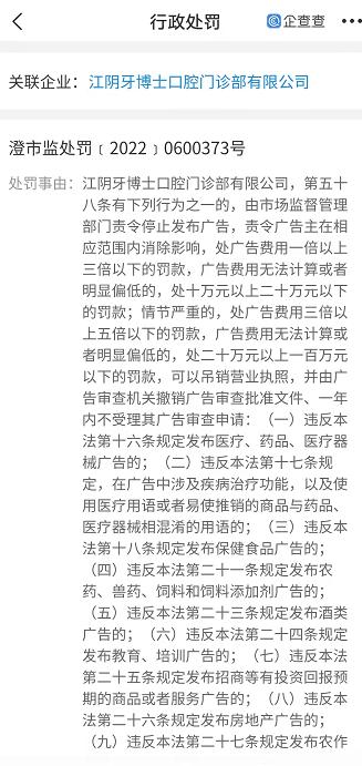 2022年4月6日,牙博士旗下江陰牙博士口腔門診部有限公司因涉嫌違反《中華人民共和國廣告法》第五十八條規定,被立案調查。企查查顯示,該起違法違規共涉及14項之多。最終,牙博士被江陰市市場監督管理局罰款30萬元。